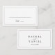 Cette carte minimaliste à mariage plat est parfaite pour une réception de mariage simple. Le design romantique moderne présente une typographie classique en noir et blanc associée à une calligraphie rustique mais élégante avec un style vintage lettré à la main. Personnalisable dans n'importe quelle couleur. Gardez le design simple et élégant, en l'état, ou personnalisez-le en ajoutant vos propres graphiques et artwork. Personnalisez le dos des cartes de lieux avec les noms de la mariée et du marié et la date. Achetez en gros et écrivez à la main les noms des invités et les numéros de table sur les cartes imprimées à leur arrivée.