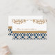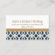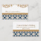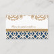 Elégante et belle carte de table mariage d'inspiration carrelée marocaine avec un motif motif géométrique bleu marine et or répétitif et doré hued style baroque français france fleurie. Nos cartes de table haut de gamme et luxueuses sont parfaites pour un mariage à thème marocain, arabe ou aladdin. L'avant et l'arrière de ces cartes personnalisées peuvent être personnalisées avec les noms de la date de la mariée et du marié et du mariage et un message spécial pour vos invités. Oeuvre et design © Chrissy H. Studios, LLC. Tous droits réservés.