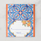 Elle a trouvé ses cartes de table de fête de mariage Squeeze principale bleu orange, carreaux de Majjolica espagnol méditerranéen une grappe d'oranges avec un script moderne décontracté, convient pour les cartes de table de fonctions extérieures d'été