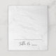 Des cartes de mariage pliées élégantes et modernes, avec une police de caractères noir tendance, un arrière - plan en marbre blanc et un espace prévu pour le nom et le numéro de table de votre client. Le revers des cartes élégantes de lieu de mariage peut être changé en une couleur de votre choix avec l'outil de Personnaliser.