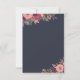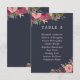 Élégantes cartes de plan de mariage florales en bleu foncé avec place pour jusqu'à dix invités en texte blanc, avec de beaux bouquets de fleurs comprenant des roses roses et des hortensias bourguignons.