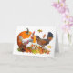 Un trio de poules se régalent d'automne entouré de feuilles de chêne coloré, d'un grand citrouille orange et d'un tas de raisins mûrs sur cette carte de poulet d'automne.