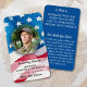 Premium USA American Flag Memorial Funeral Prayer Card. Cette carte de prière commémorative militaire présente un drapeau des États-Unis d'Amérique dans un design moderne. Avant "In Loving Memory" Personnalisez cette carte de prière funéraire militaire avec vos proches photo, nom & dates, et sentiment. Avant "In Loving Memory" "Les héros vivent pour toujours". Personnalisez cette carte de prière funéraire militaire avec vos proches photo, nom & dates, et sentiment. Retour citation "Un héros est...quelqu'un qui a donné sa vie à quelque chose de plus grand que soi." et Prière "Nous vous tenons près." , s'il vous plaît tendre la main si vous voulez un design avec un poème spécifique autre que. Cette carte de prière du drapeau américain est un souvenir précieux, rend hommage à un soldat déchu, aux services funéraires militaires, au service commémoratif des anciens combattants ou à la célébration de la vie. Dans Loving Memory Military Memorial American Flag Prière Cartes. DROIT D'AUTEUR © 2020 Judy Burrows, Black Dog Art - Tous droits réservés. Carte de prière commémorative des soldats tombés