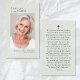 Ces cartes de prière photo de la taille d'un porte-monnaie sont faciles à porter dans un porte-monnaie ou un porte-monnaie, ce qui en fait un souvenir attentionné pour les amis et la famille qui assistent à des funérailles, à un service commémoratif ou à une célébration de la vie. Cette carte a été conçue avec le Psaume vingt-trois, mais vous pouvez la changer en une autre prière ou poème en utilisant le bouton Personnaliser. La photographie est à des fins d'illustration et peut être changée en une de vos propres.