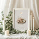 Doté d'une belle image catholique traditionnelle d'un crucifix en or avec deux anneau mariage agrémenté de fleurs. Les coeurs de Jésus, Marie et Joseph sont à l'arrière. Une prière est également à l'arrière pour la mariée et le marié. Tout le texte et les polices peuvent être modifiés.