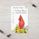 Cardinal d'aquarelle et tournesols avec des cartes de prières funéraires sympathy eucalyptus. Cette carte de prière commémorative moderne mais élégante présente un oiseau cardinal rouge dans un bouquet de tournesols. Avant "In Loving Memory" Personnalisez cette carte de prière funéraire commémorative avec vos proches nom et date, et sentiment. Retour ~ Poème 'Puissiez-vous toujours marcher dans Sunshine', qui peut être personnalisé, s'il vous plaît tendre la main si vous voulez un design avec un poème spécifique autre que. Cette carte de prière commémorative sera un souvenir précieux, pour les services funéraires et la célébration de la vie. DROIT D'AUTEUR © 2020 Judy Burrows, Black Dog Art - Tous droits réservés. Carte de prière funéraire commémorative Cardinal Sunflowers