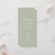 Cette carte de programme de mariage simple et magnifique présente un design typographique élégant, moderne et minimal avec un thème vert sage. Prêt pour vous à customiser avec les détails de votre cérémonie de mariage. Veuillez naviguer dans la suite de Mariage minimal Sage Green Elegant pour rechercher des articles de papeterie correspondants.