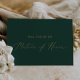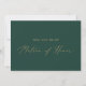 Cette délicate carte d'offre en or et en vert matron d'honneur est parfaite pour un mariage moderne. Le design minimaliste romantique présente une belle et élégante typographie de champagne jaune doré sur un arrière - plan vert émeraude à l'allure simple et épurée. Customisez la carte avec le nom de la mariée et le matron d'honneur. Personnalisez le dos de la carte avec un message personnalisé.