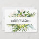 Cette élégante carte de proposition de femme de chambre verte d'olivier est parfaite pour votre mariage boho d'été moderne. Il est conçu avec de l'aquarelle vert émeraude et des feuilles de couleur sauge, des touches d'or botanique, des fleurs d'olivier rose vif et une simple typographie vintage noire. Tous ces éléments se conjuguent pour créer une belle atmosphère bohème.