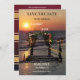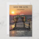 Carte de rappel de date mettant en vedette un coucher de soleil sur la plage avec une tonnelle de roses et des guirlandes lumineuses. Au verso, il y a un espace pour votre propre photo. Vous pouvez utiliser le modèle de code QR pour créer un lien vers votre propre site web.