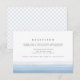 Élégantes cartes d'insertion de réception de mariage à l'aquarelle présentant un effet de dégradé ombré dip dye en bas dans un bleu ciel aéré. Personnalisez avec vos informations de réception, heure, lieu et adresse en typographie bloc et script gris charbon foncé. Les cartes d'insertion de réception sont réversibles sur un motif de treillis diamant subtil en bleu pâle et blanc. Conçues pour coordonner avec notre collection d'invitations de mariage Dip Dye en Ciel.