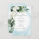 Ce design de carte de réception de mariage présente une belle végétation tropicale luxuriante et des fleurs blanches sur un arrière - plan d'eau bleu aqua des Caraïbes doux. Parfait pour la destination ou le mariage sur la plage. Créé par Simply Farmhouse Press.
