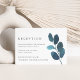 Conçu pour s'harmoniser avec notre collection de mariages botaniques habillés, cette carte d'enceinte ultra-chic bleu et blanc présente une source unique de feuillage botanique turquoise d'aquarelle foncé et vibrante, ainsi que vos détails de réception, y compris le timing, le lieu et l'adresse.