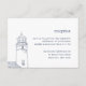 Carte d'invitation de réception de mariage de style côtier romantique avec les détails de la réception (horaire, lieu et adresse) en bleu marine classique, accompagnés d'une illustration de phare dessinée à la main de style vintage. Le verso des cartes présente un motif de corde nautique blanche sur fond bleu portuaire.