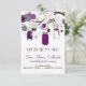 Illustrations fantaisistes de pots Mason violets et de cordes de coeurs suspendus à un arbre avec deux oiseaux amoureux entourés d'une variété de fleurs. C'est parfait pour les mariages d'été, de printemps et en plein air. Cela fait partie d'une suite d'invitation de mariage.