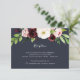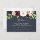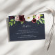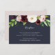 Conçue pour coordonner avec notre collection de mariages Blush Romance et Midnight Romance, cette élégante carte d'enceinte à aquarelle fleurie présente un spray de fleurs de marsala rose, ivoire et bordeaux, surplombant vos détails de réception de mariage, lieu et timing en blanc sur bleu marine riche. Des ressorts de feuillage botanique vert complètent le look.