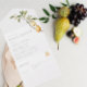 Une élégante prise sur une invitation à la douche de mariée Perfect Pear avec poires aquarelles, fleurs, feuilles et branches. L'invitation comprend une carte de recette pratique pour déchirer que les clients peuvent remplir et apporter à la douche.