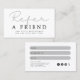 Augmentez votre activité grâce à une carte de rabais de référez-vous à un ami! Récompensez vos clients fidèles et attirez-en de nouveaux avec notre modèle de carte de rabais de référence à un ami. Encouragez vos clients à faire connaître votre entreprise et à surveiller la croissance de vos ventes. Voici ce que comprend notre modèle : Un design entièrement personnalisable : Personnalisez la carte avec le logo, les couleurs et la messagerie de votre marque pour en faire la vôtre. Instructions simples : Expliquez clairement comment fonctionne la carte afin que vos clients puissent facilement comprendre et commencer à faire référence à leurs amis. Options de remise flexibles : Choisissez le montant ou le pourcentage de remise qui convient le mieux à votre entreprise et à vos clients. En utilisant notre carte de rabais "référez-vous à un ami", vous pouvez : ⟶ Augmenter la fidélité de vos clients : Vos clients apprécieront l'occasion d'économiser de l'argent et d'être récompensés pour leurs références. ⟶ Acquérir de nouveaux clients : Vos clients actuels sont susceptibles de diriger leurs amis et leur famille, ce qui peut vous aider à atteindre de nouveaux publics et à accroître votre clientèle. ⟶ Augmentez vos ventes : plus vous obtenez de références, plus vous faites de ventes et plus votre entreprise réussira. Procurez-vous votre modèle de carte de rabais de référence à un ami dès aujourd'hui et commencez à booster votre entreprise !