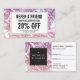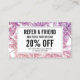 Coordonner avec le modèle Tropical Purple/Pink Parties scintillant Palms Business Card pour 12 h 01. Des silhouettes de fleurs de palmiers créent un décor tropical sur ce modèle moderne et sophistiqué de carte de référence salon. Votre nom ou nom d'entreprise est coiffé d'une simple boîte noire à l'arrière pour une esthétique minimale et propre. Mettez à jour le texte de promotion avec votre récompense de référence désirée. © 1201AM CREATIVE
