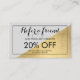 Coordonner avec le modèle de carte de visite Edgy Geometry Faux Gold Foil et Grey Color Block d'ici 12 h 01. Cette conception personnalisable de carte de référence comporte un faux coin trempé de feuille d'or créant une forme intrigante juxtaposée à un arrière - plan gris. Les cartes de recommandation sont idéales pour permettre à vos clients de faire connaître vos services en échange de rabais ou de promotions. Mettez à jour le texte de promotion pour votre propre offre unique. Art et design © 1201AM CREATIVE | www.1201am.com