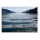 Réflexions regardant en bas du lac de mon bateau, montagnes dans la distance. Nuages et ciel vus sur la surface du lac.