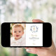Une carte de remerciement de baptême moderne et élégante. Un fond blanc chic orné d'une couronne florale bleue à l'aquarelle, d'un nœud et d'une croix dorée. Personnalisez et ajoutez votre photo de l'enfant, votre note de remerciement et son nom.