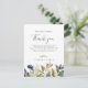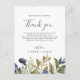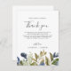 Cette carte de remerciement de réception de la végétation d'automne est parfaite pour un mariage d'automne. Le design rustique moderne présente des feuilles de couleur bleu marine, vert sauge et or avec des brindilles de fleurs bleu foncé. Placez ces cartes sur chaque table pour chacun de vos invités à votre réception de mariage. Personnalisez la carte avec vos noms et un message de remerciement spécial.