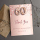 Un carte de remerciements pour un 60e anniversaire. Couleur arrière - plan rose or dégradé. Avec de l'or rose gouttant des étoiles brillantes. A l'avant : numéro 60 écrit avec une police de style ballon, grand rose foncé écriture manuscrite couleur or et le texte : Merci, votre texte, titre et une date. Retour : Personnalisez et ajoutez Votre note de remerciement et votre nom.