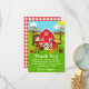 Cette carte de remerciements mignonne et amusante a une fille aux cheveux bruns avec un panier de pommes et un épouvantail et corneille. Dans l'arrière - plan est une grange rouge vif, une clôture marron piquetée, arbres, soleil, citrouilles et paniers de maïs et de pommes. Le texte combine des polices audacieuses et sans serif pour un look élégant et moderne. C'est parfait pour une fête d'automne sur le thème de l'anniversaire. Graphiques de MUJKA