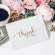 Cette simple carte de remerciements de calligraphie dorée est parfaite pour une douche nuptiale, un mariage ou un anniversaire. Le design romantique classique présente une typographie de feuille d'or et un coeur doré. Le dos est vide, vous aurez donc beaucoup de place pour écrire un message personnalisé réfléchi. Remarque : Ce design ne comporte pas de véritable feuille d'or. C'est un graphisme de haute qualité fait pour ressembler à du papier doré.