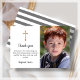Célébrez avec style la première sainte communion de votre enfant et remerciez vos invités pour leur présence avec nos excellentes cartes de remerciement de la première sainte communion. Doté d'un crucifix orné à effet or étonnant et d'un message personnalisable qui vous permet d'express votre gratitude à votre famille, vos amis et ceux qui ont partagé ce moment spécial avec vous et votre enfant. De plus, vous pouvez personnaliser la carte avec le nom de votre enfant dans une belle police de script, ce qui en fait un gardien unique pour tous ceux qui la reçoivent. Et si ce n'est pas suffisant, vous pouvez aussi ajouter une photo de votre enfant à la carte, ce qui en fera un souvenir chéri pour les années à venir. Au verso de la carte, un motif rayé design en gris et blanc apporte une touche sophistiquée qui fera une impression durable sur vos invités. Avec nos Cartes de Remerciements de la Première Communion, vous pouvez express vos remerciements d'une manière à la fois élégante et sincère.
