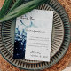 Ce design Carte de remerciements de mariage de destination bleue associe le blanc élégant et le blanc classique avec des vagues d'aquarelle bleu foncé comme décor somptueux pour une typographie minimaliste sophistiquée et des détails de script boho. Idéal pour une esthétique nautique de luxe moderne, avec un style de plage marine d'ambiance unique. Cette collection magnifiquement guidée donnera le ton de l'élégance polie pour votre mariage de rêve ou événement spécial. Si vous avez des questions ou des demandes spéciales concernant ce design, n'hésitez pas à demander!