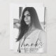 Carte de remerciements de graduation simple et moderne avec la photo verticale du diplômé avec "Merci" dans une superposition de script noir élégant. Personnalisez le devant du carte de remerciements de remise de diplômes en ajoutant le nom du diplômé et l'année de remise de diplômes. L'arrière du carte de remerciements photo de graduation comporte un arrière - plan motif noir et blanc dessiné à la main avec de l'espace pour votre message dactylographié ou manuscrit.