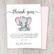 Douche bébé fille mignonne ou saupoudrer de carte de remerciements avec "merci" dans un élégant script gris doux avec des swashes et une aquarelle rose de bébé éléphant. En dessous, vous pouvez facilement personnaliser votre message de remerciement en simple topographie grise ou laisser vide pour une note manuscrite.