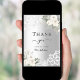 Une carte de remerciements nuptiale moderne et élégante. Un arrière - plan faux argenté. Décoré de roses blanches, fleurs florales et dentelle. Sur le devant le texte : Merci, demain mrs. Retour : Modèle pour Votre mot de remerciement et nom.