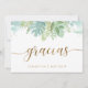 Elégante Carte de remerciements à l'aquarelle délicate et verdoyante, alliant bleu poussiéreux, turquoise, aqua et vert doux. Or "Gracias" en calligraphie manuscrite moderne. Design également disponible en anglais. Détails dorés en étincelle et typographie. Ajoutez votre message dans le dos ou laissez les sections de texte en arrière vides pour écrire une note personnelle sur chaque carte plus tard une fois que vous les recevez. Possibilité de modifier la couleur du texte (si vous préférez le noir), la taille et le style en sélectionnant personnaliser. Une partie de notre collection "Airy Blue and Green Watercolor" avec une variété de produits de coordination disponibles. Des paquets de 5 cartes vierges font aussi pour de grands cadeaux de faveur!