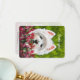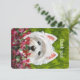 West Highland White Terrier et fleurs roses. Westie chien regardant au-dessus d'un buisson fleuri. Sophie. Copyright © 2025 Angi Laframboise. Le chien d'art brasse des cadeaux pour les amoureux de les chiens.