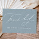 Carte de remerciements de mariage élégant avec "Merci" dans un script de calligraphie blanche avec votre nom affiché ci-dessous avec un arrière - plan bleu poussiéreux. L'élégante carte de remerciements de mariage s'inverse pour afficher votre message de remerciement personnalisé et vos prénoms en lettres blanches. Le design est coordonné avec notre collection Modern Elegance mariage.