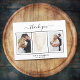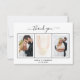 Un Carte de remerciements mariage élégant et simple de la mariée et du marié, personnalisé avec votre propre photo. Ajoutez 3 de Vos photos mariages, taille verticale, date du mariage, vos noms et la note de remerciement. Un arrière - plan blanc chic avec du texte noir et un cadre blanc. Le texte : Merci sur l'avant et vos noms sur l'arrière sont écrits avec une écriture manuscrite stylisée.