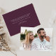 Cartes de remerciement de mariage élégantes avec votre photo de mariage horizontal à fond de sang avec "Merci" en lettres violet de prune. Personnalisez le carte de remerciements photo moderne avec votre nom. Le dos du carte de remerciements mariage photo affiche votre message personnalisé en lettres blanches avec un arrière - plan violet solide.