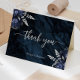 This elegant wedding thank-you card features navy blue floral bouquets set off with silver faux foil foliage in two corners, on a background image of navy blue watercolor agate. The words "thank you" appear in silver gray handwriting script with flourishes at the beginning and end. Add the first names of the newlyweds in italics below.