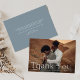Elégante carte de remerciement de mariage avec votre photo mariage horizontale à fond de sang avec "Merci" en papier-feuille argent. Personnalisez le carte de remerciements photo moderne avec votre nom. Le dos du carte de remerciements mariage en feuille d'argent affiche votre message personnalisé en lettres blanches avec un arrière - plan bleu foncé.
