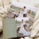 Send your family and friends a special wedding thank you with these custom photo cards. A vertical photo appears on the right half. On the left, the words "Thank You" appear in elegant ivory handwriting script typography on a sage green background over a brief, editable message of thanks to your wedding guests in copperplate font, with your names below. A gold faux glitter border decorates the left edge. The reverse side provides space for a second, horizontal photo.