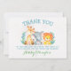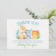 Ce baby shower d'animaux de safari d'aquarelle vous remercient la carte que plate pourrait être aussi bien employée pour d'autres occasions. Les caractéristiques de conception une girafe, un éléphant et un lion sur une aquarelle balayée empaquettent l'arrière - plan. J'ai également ajouté du feuillage vert-bleu à la conception. J'ai voulu créer quelques invitations de baby shower d'animaux de safari et vous remercier des cartes du magasin parce que c'est un thème populaire et doux. Ce carte de remerciements d'animaux de safari est prêt à être personnalisé. La même invitation de baby shower de conception est également disponible au magasin.