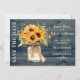 Définissez le ton de votre mariage champêtre avec cette carte de remise à date tournesol rustique représentant un bouquet dans un pot mason, un fond en bois, et une calligraphie romantique. Idéal pour les mariages d'automne, les lieux de grange, ou les célébrations sur le thème des tournesols. Personnalisez facilement avec vos noms, date, et message personnalisé pour créer une première impression sincère.
