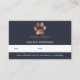 Cartes de rendez-vous élégantes pour les salons d'animaux de compagnie, les toiletteurs ou les promeneurs de chiens. Personnalisez avec vos initiales ou votre nom d'entreprise sous le logo d'un empreinte de patte de feuille d'or rose sur un arrière - plan bleu marine riche. Modifiez votre politique d'annulation et ajoutez votre nom ou nom d'entreprise et vos coordonnées au verso.