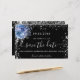 Une carte de rendez-vous féminine et tendance pour une fête d'anniversaire de 50 ans (ou tout âge). Un fond noir classique orné de faux paillettons argentés et de fleurs bleues. Personnalisez et ajoutez une date et un nom/âge. Le texte : Enregistrez la date est écrit avec un grand style de lettrage manuscrit tendance.