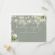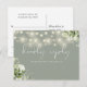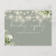 Une carte de réponse à une demande de chanson élégante avec feuillage floral, guirlandes lumineuses et typographie chic sur fond vert sauge. Le verso présente vos coordonnées et une demande de chanson d'invité amusante. Conçu par Thisisnotme©