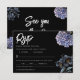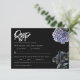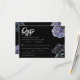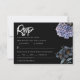 Une carte de réponse audacieuse et sophistiquée présentant des illustrations florales dramatiques bleu poussiéreux et gris sur un fond noir intense. La typographie blanche croquante et la mise en page classique créent une atmosphère élégante et lunatique. Parfait pour une soirée formelle ou un mariage sophistiqué.