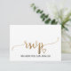 Cette simple carte de réponse de site web de mariage à la calligraphie dorée est parfaite pour un mariage chic. Le design romantique classique présente une typographie à la feuille d'or fausse et un cœur doré charmant. Personnalisez la carte de réponse en ligne avec votre RSVP par date et l'adresse du site web de mariage. Si vos invités n'ont pas besoin de mot de passe pour le site web, vous pouvez remplacer le texte par un message court et doux pour vos invités ou une méthode de RSVP alternative.